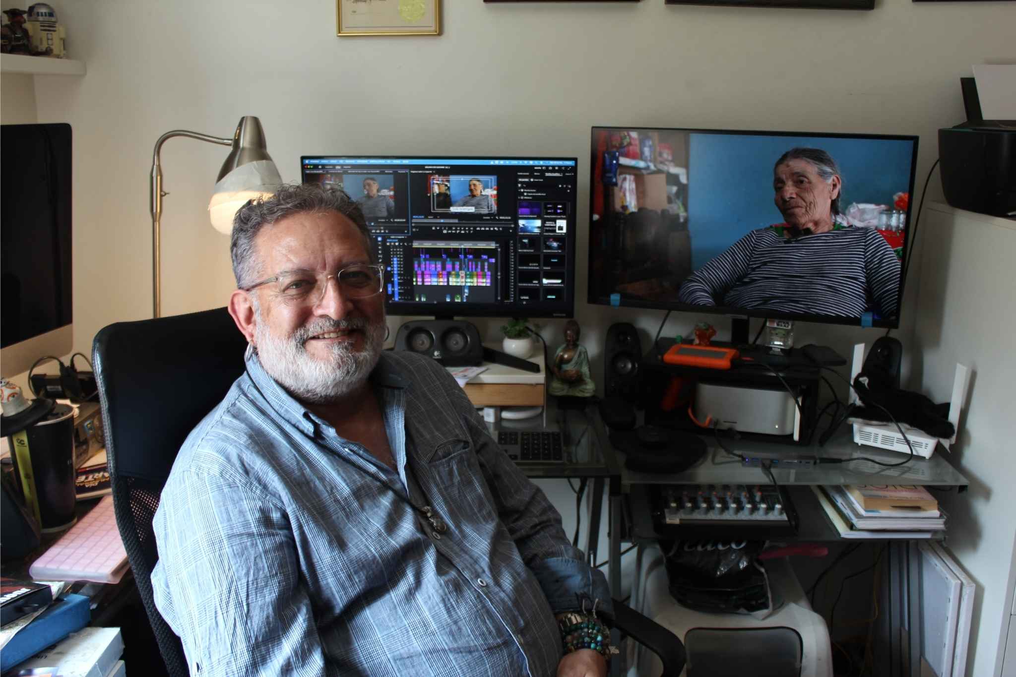 La entrevista ocurre en su oficina. Allí, frente a dos monitores encendidos y rodeado de discos duros, cables y pequeños parlantes, Humberto se sienta frente al computador. En una de las pantallas hay un programa de edición lleno de líneas de colores que representan video, sonido y música. El ambiente recuerda más a un estudio de montaje que a una oficina doméstica.